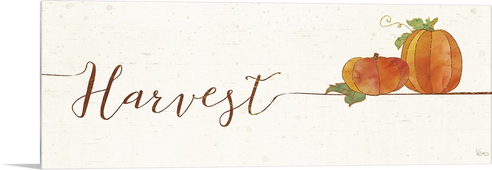 <p>Horizontal artwork of "Harvest" in handwritten text with a pair of pumpkins.</p>