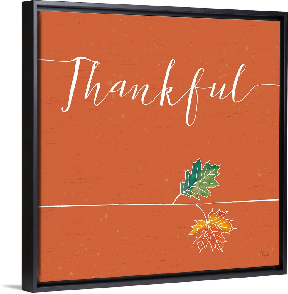 <p>"Thankful" with a pair of fall leaves on a wood textured orange background.</p>