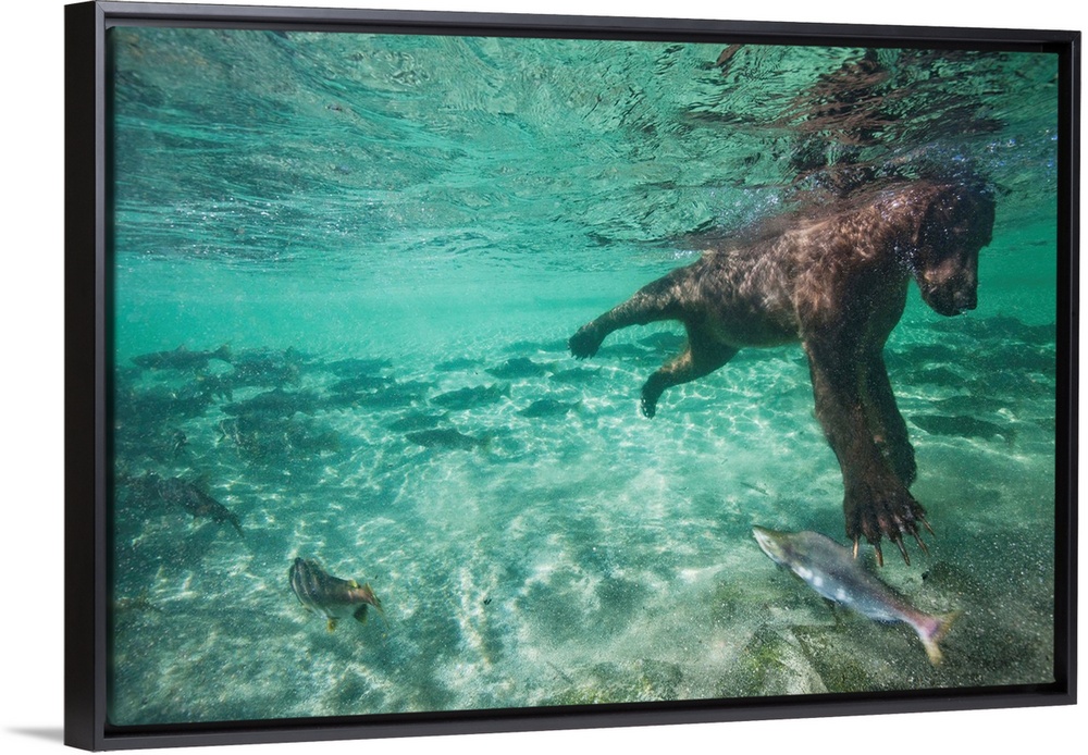 <p>USA, Alaska, Katmai National Park, Underwater view of Grizzly Bear (Ursus arctos) swimming after spawning salmon in Kuliak Bay on summer evening. Photograph by Paul Souders.</p>