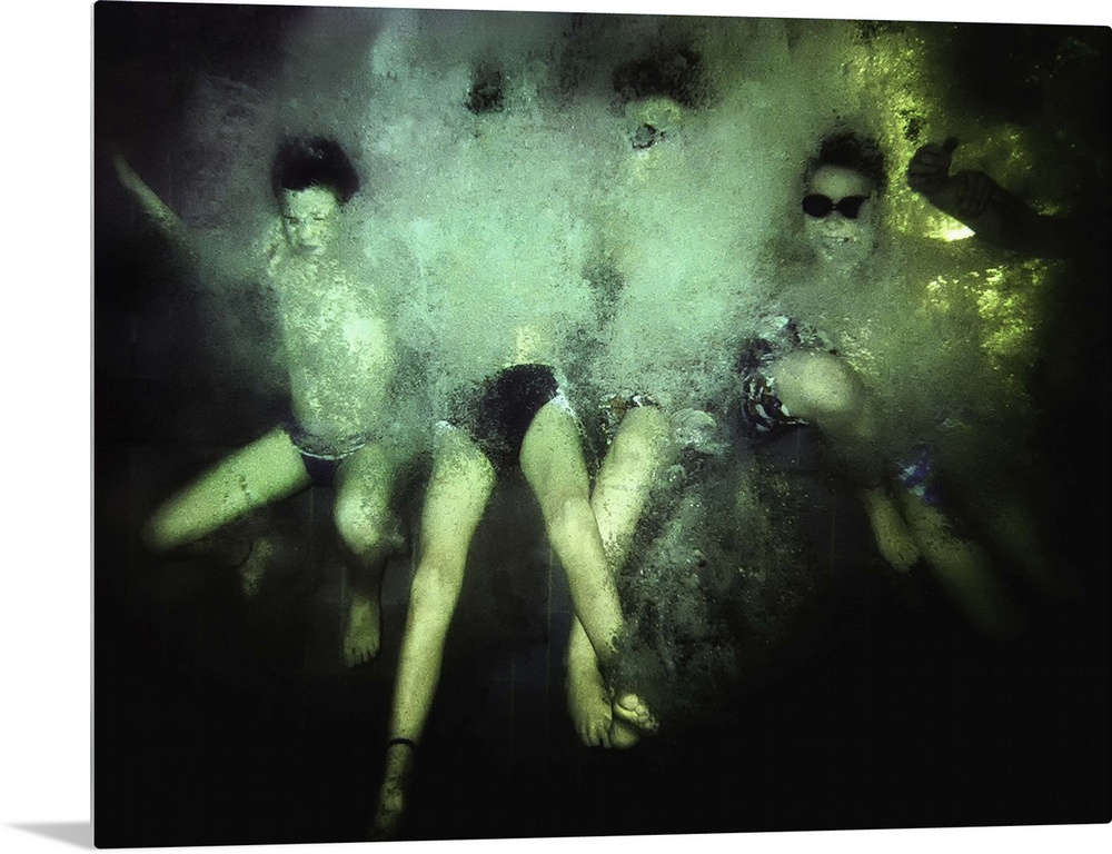 <p>Underwater view of a group of children the moment they splash into the pool, creating a flurry of bubbles.</p>