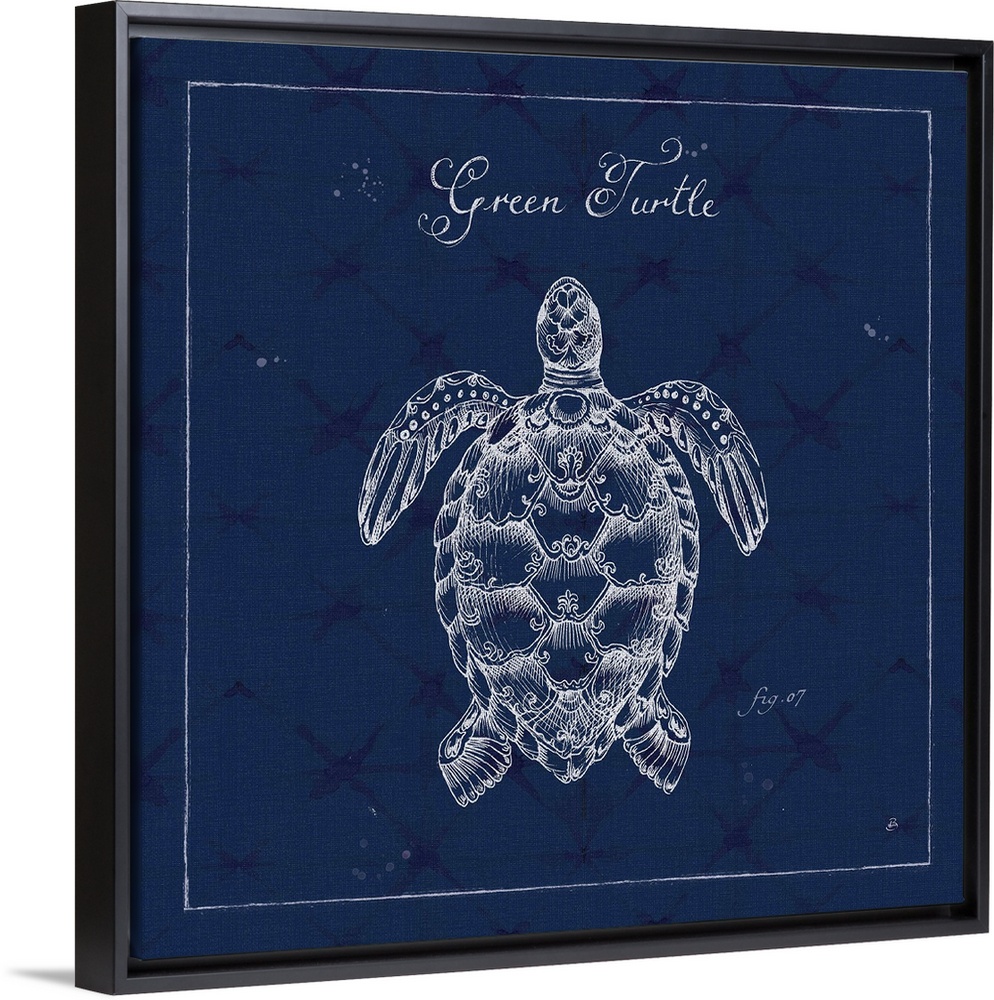 <p>Square illustration of green turtle in a pen and ink style with a blue weaved texture backdrop.</p>