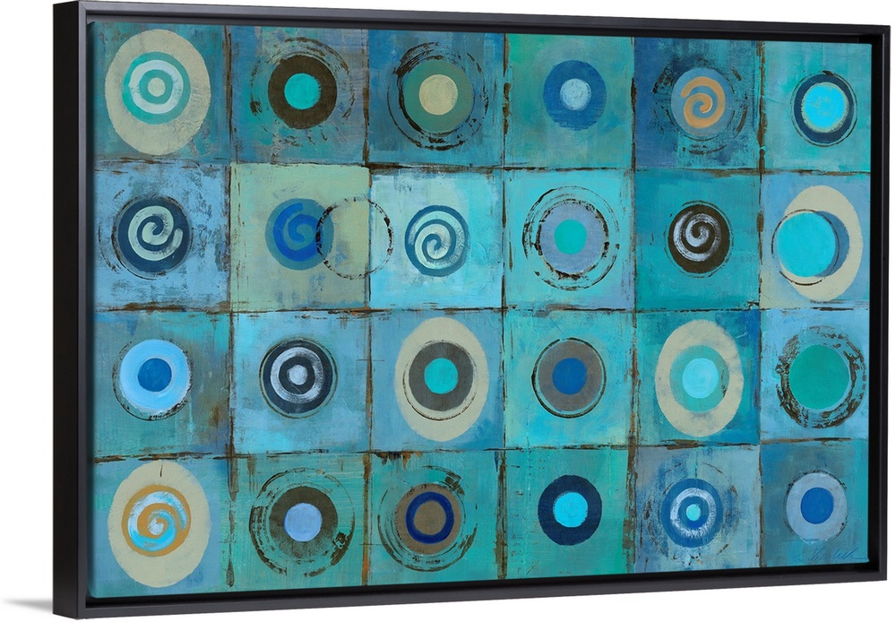 <p>A decorative accent for the home or office this horizontal painting shows a grid of twenty-six circles and spiral shapes in aquatic jewel tones.</p>