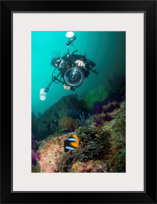 <p>Underwater photographer capturing the picture of a black and orange clownfish.</p>