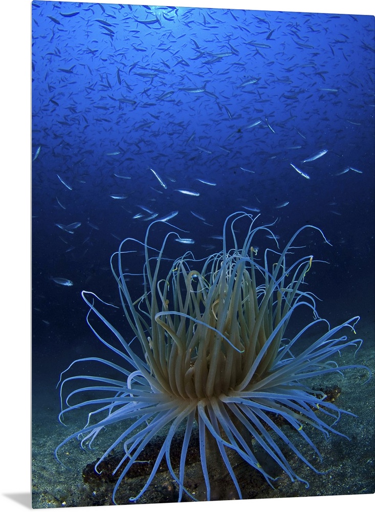<p>Large school of sardines feeding on sandy village of cerianthids (Cerianthus membranaceus).</p>