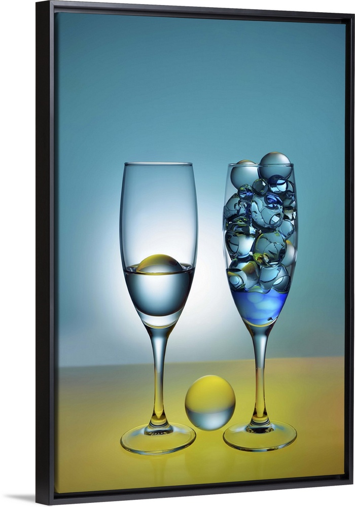 <p>A photograph of glass orbs sitting in tall wine glasses.</p>