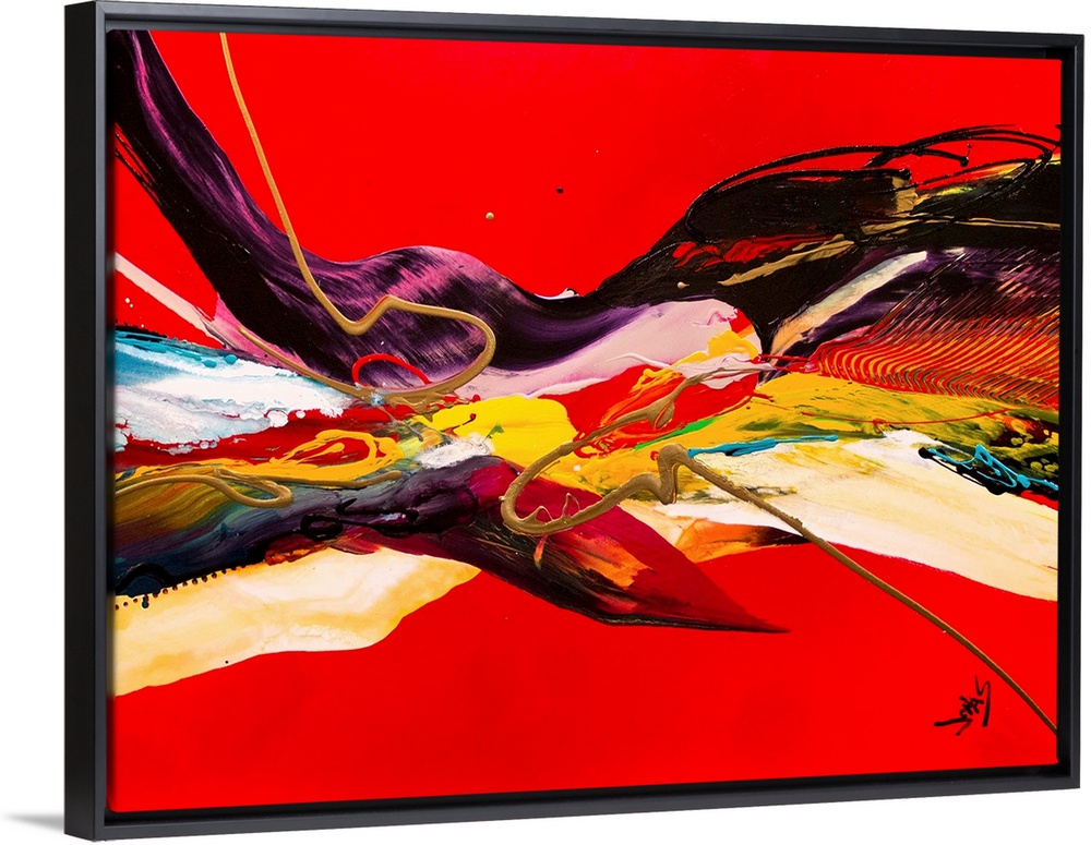 <p>A contemporary abstract painting of a fluid motion of color and texture against a red background.</p>