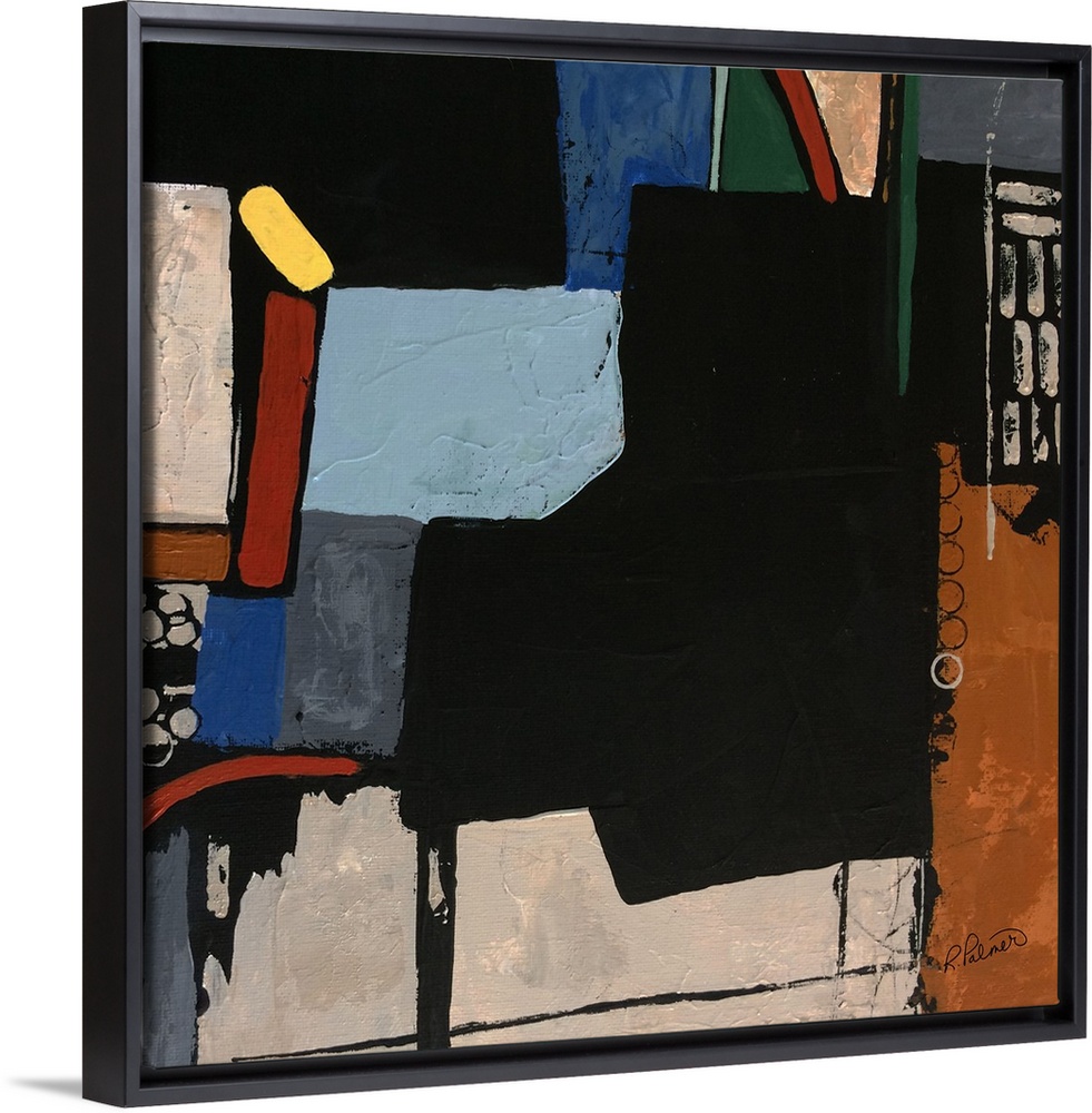 <p>Square abstract painting with muted and neutral colored shapes mixed with a few colorful shapes and big, bold black designs overpowering all.</p>