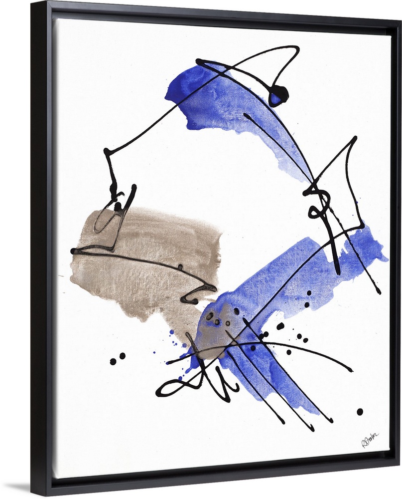 <p>Contemporary abstract painting of dark black lines and splashes of blue swirling around.</p>