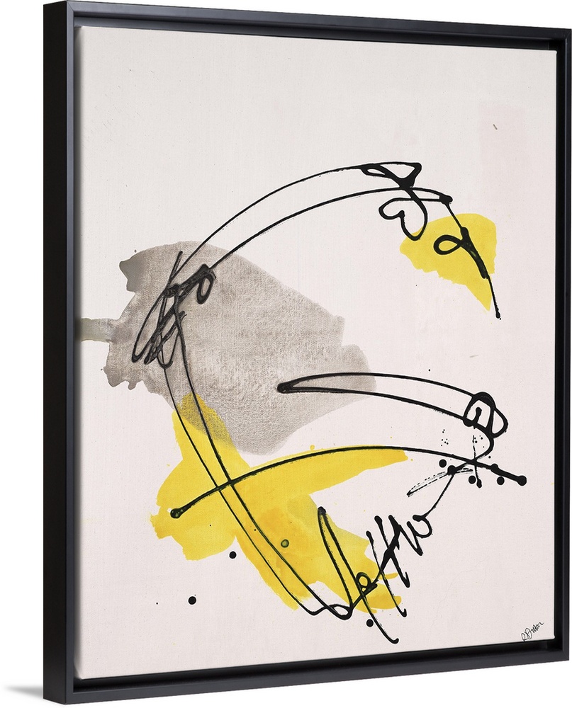 <p>Contemporary abstract painting of dark black lines and splashes of yellow swirling around.</p>