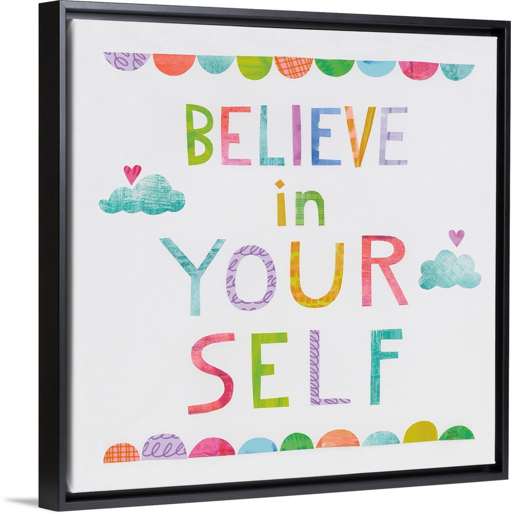 <p>Whimsy inspirational decor with the phrase "Believe In Yourself" written in different colors.</p>