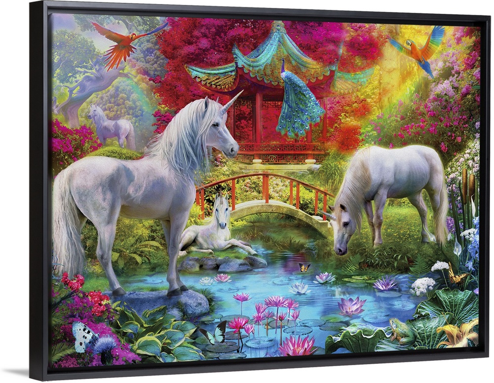 <p>Fantasy illustration of unicorns at a pond filled with lily pads and lotus flowers with a bridge rainbows in the background.</p>