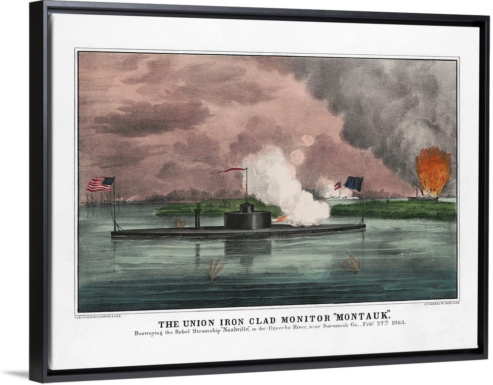 <p>The Union Iron Clad Montauk destroying the Rebel Ship Nashville during a naval battle in the Ogeechee River.</p>