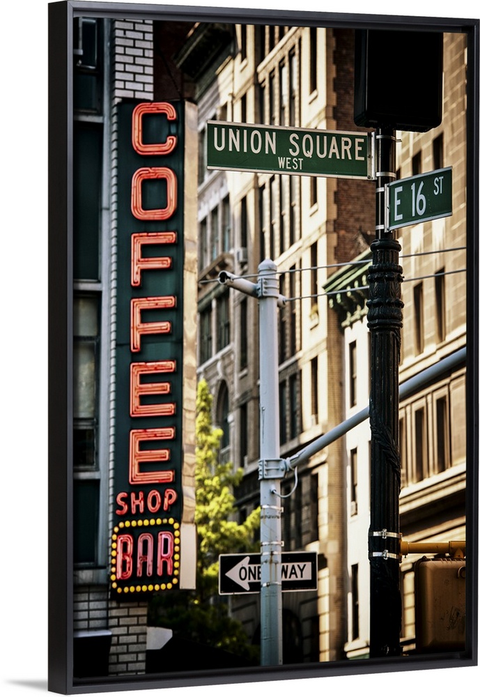 <p>Street sign for Union Square, dwarfed by a gigantic neon coffee shop sign in the background.</p>