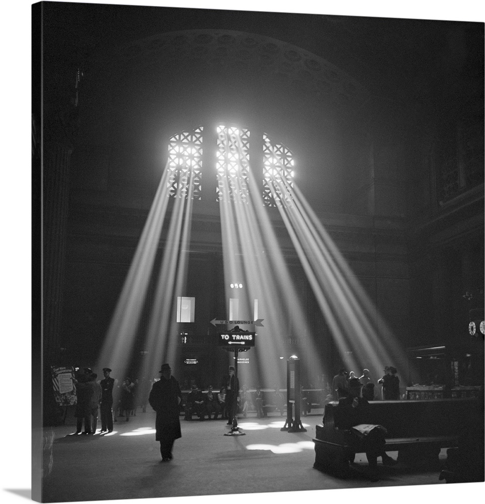<p>Shafts of light from a high window at Union Station waiting room, Chicago, Illinois, USA. Photographed in 1943.</p>