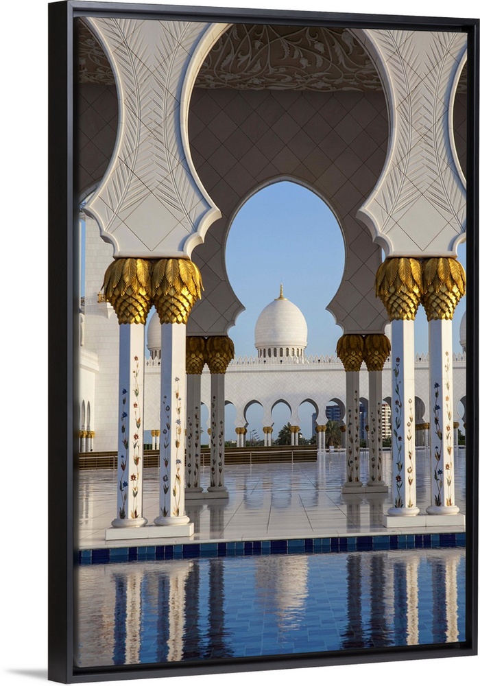 <p>United Arab Emirates, Abu Dhabi, Sheikh Zayed Grand Mosque, Gilded columns and reflecting pool</p>