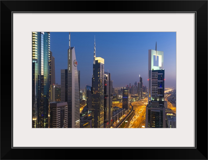 <p>United Arab Emirates, Dubai, Arab states of the Persian Gulf, Arabian peninsula, Futuristic buildings on Sheikh Zayed Road.</p>