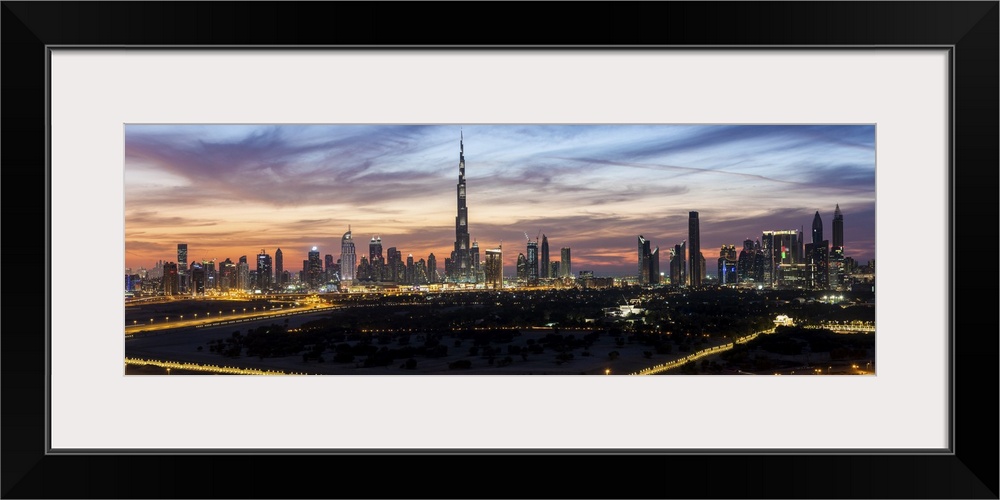 <p>United Arab Emirates, Dubai, elevated view of the new Dubai skyline, the Burj Khalifa, modern architecture and skyscrappers on Sheikh Zayed Road.</p>