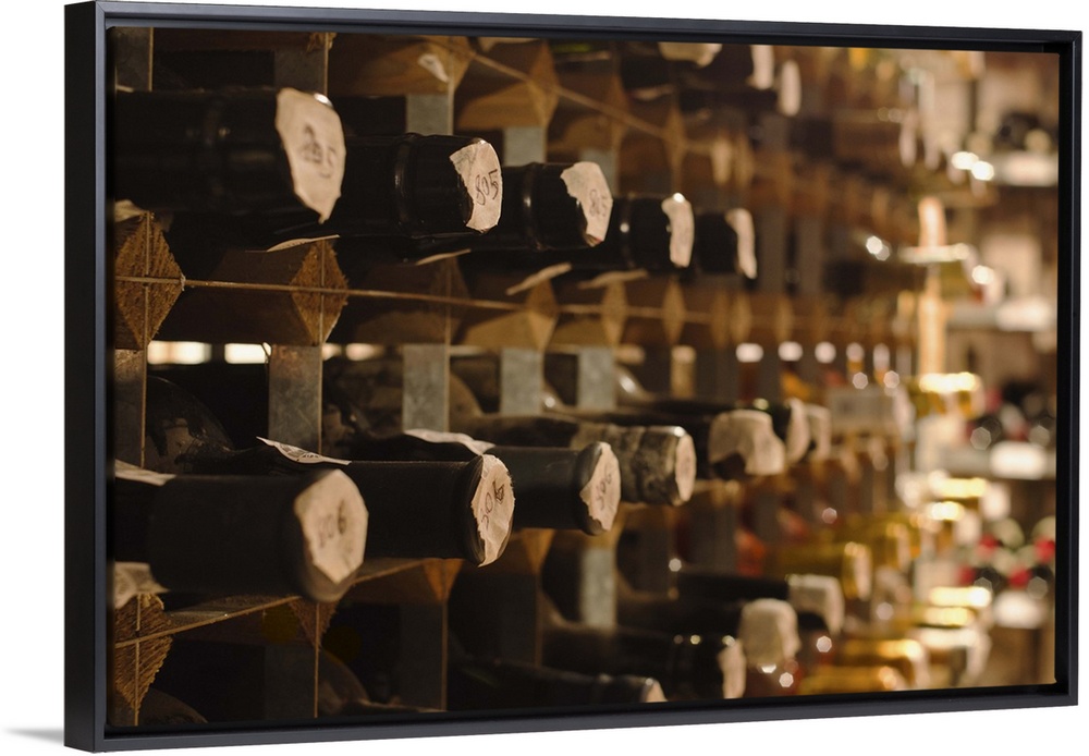 <p>United Kingdom, Bristol, old wine bottles on cellar shelves</p>