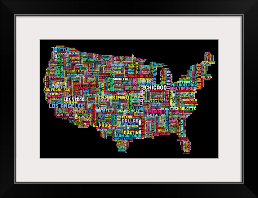 <p>Colorful map of America made of the names of each city that corresponds to its location.</p>