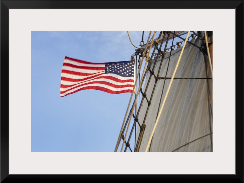 <p>United States flag flying on Hawaiian Chieftain, a Square Topsail Ketch. Owned and operated by the Grays Harbor Historical Seaport, Aberdeen, Washington State</p>