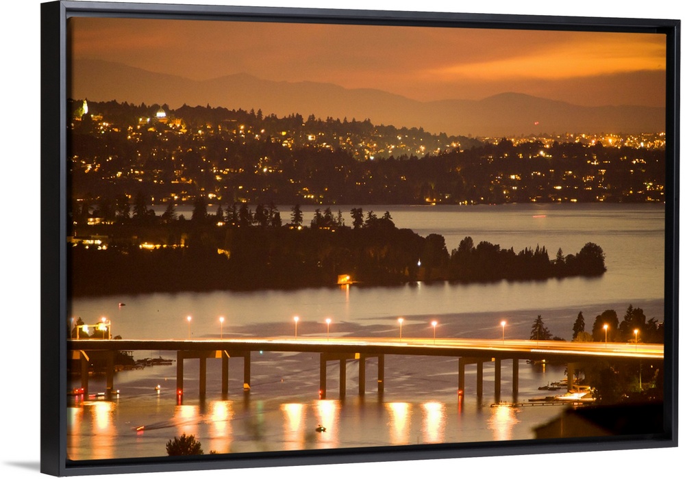 <p>United States, Washington, Lake Washington, Seattle and Olympic Mountains viewed from Bellevue at sunset</p>