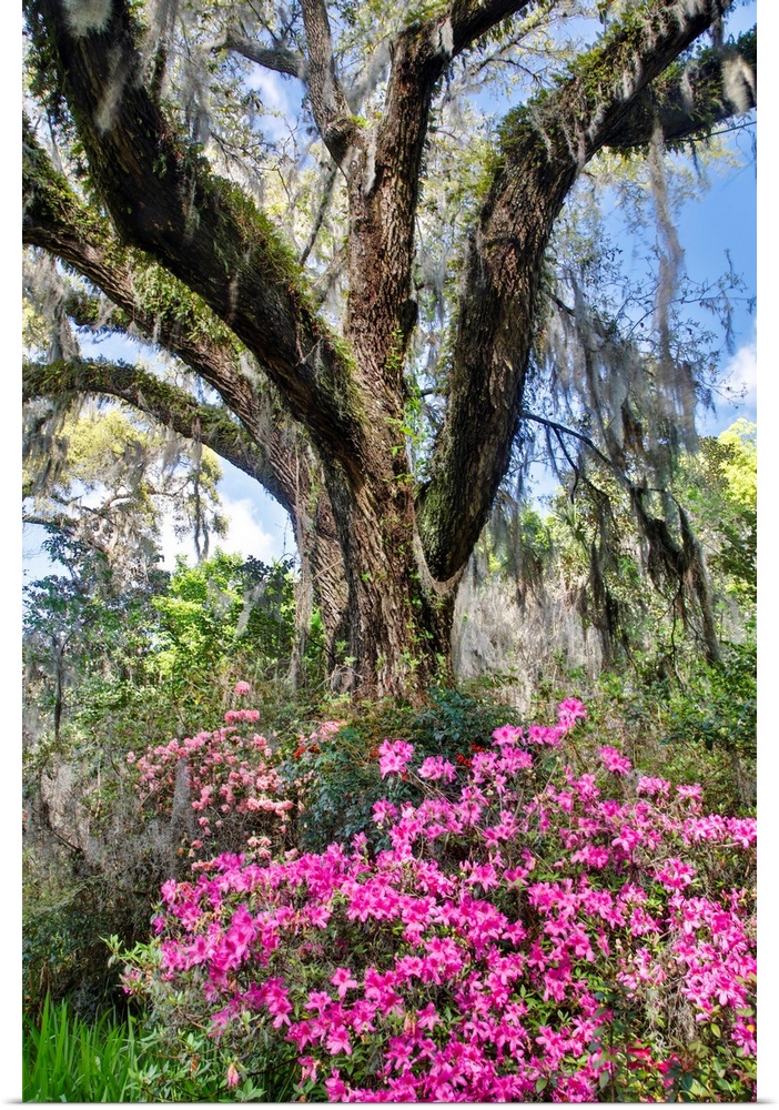 <p>United States, North Carolina, Magnolia Plantation, Moss-Covered Tree Trunk with Azaleas</p>