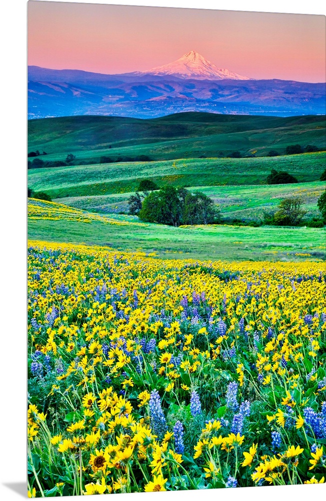 <p>United States, Oregon, Columbia River Gorge, Landscape of Field and Mt. Hood</p>