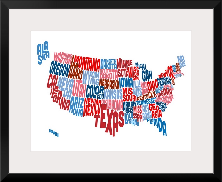 <p>Contemporary piece of artwork of a map of the United States made up of the names of the states.</p>