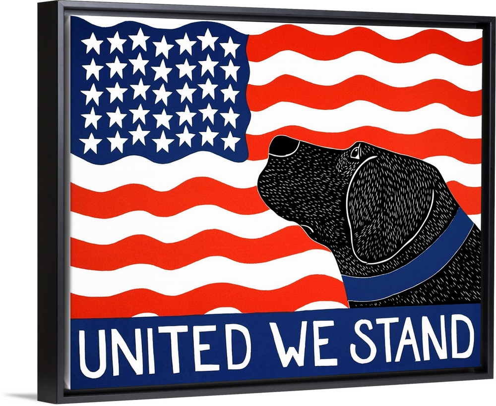 <p>Illustration of a black lab looking up at the American flag with the phrase "United We Stand" written at the bottom.</p>