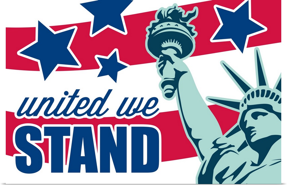 <p>"United We Stand" with a graphic designed American flag in the background and the Statue of Liberty on the side.</p>