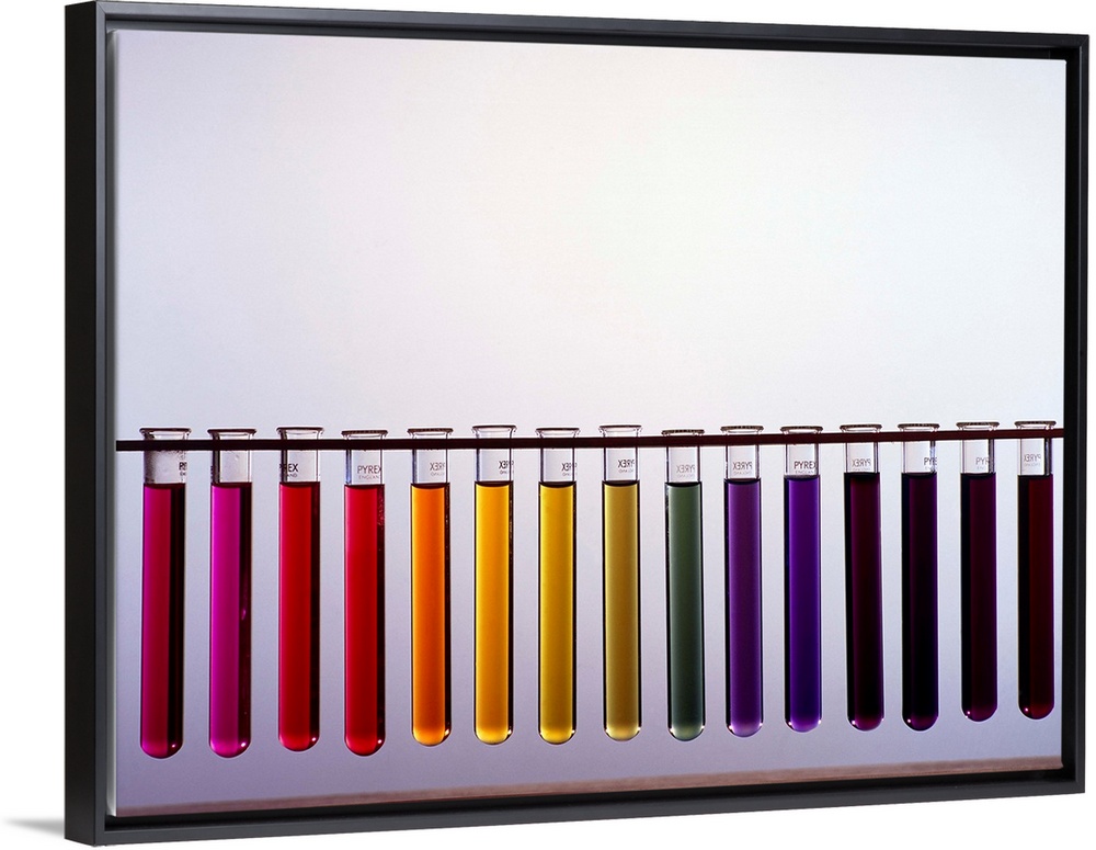 <p>Universal indicator pH scale. The pH scale measures the strength of an acid or alkali. When universal indicator is added to a solution, it changes colour depending on the solution's pH. The tubes contain solutions of pH 0 to 14 from left to right. Acids increase in strength from pH 6 to pH 0, and alkalis increase in strength from pH 8 to pH 14. The green tube (centre) is neutral, pH 7. This image is a colour-enhanced version of the actual pH scale (see image A500/252).</p>