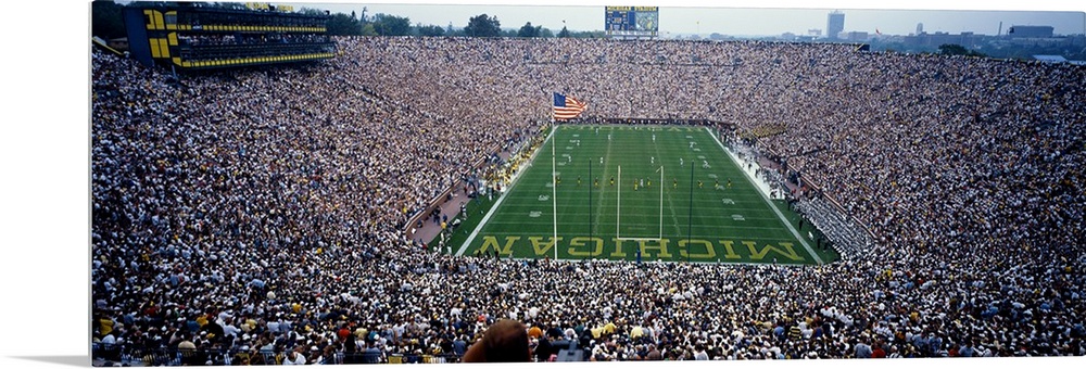 <p>Wide angle, aerial photograph of Michigan Stadium full of fans, during a University of Michigan football game in Ann Arbor.</p>