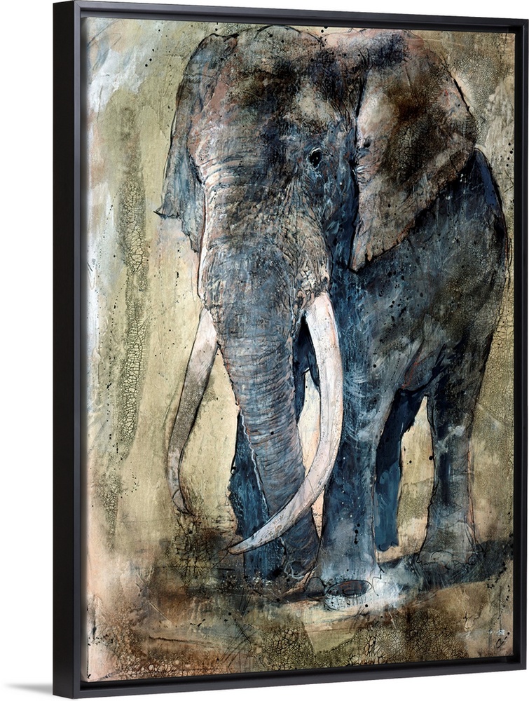 <p>Portrait artwork on a big wall hanging of an adult elephant with large tusks, walking on a flat landscape. The background has a rough, crackled textured as if on very old paper.</p>
