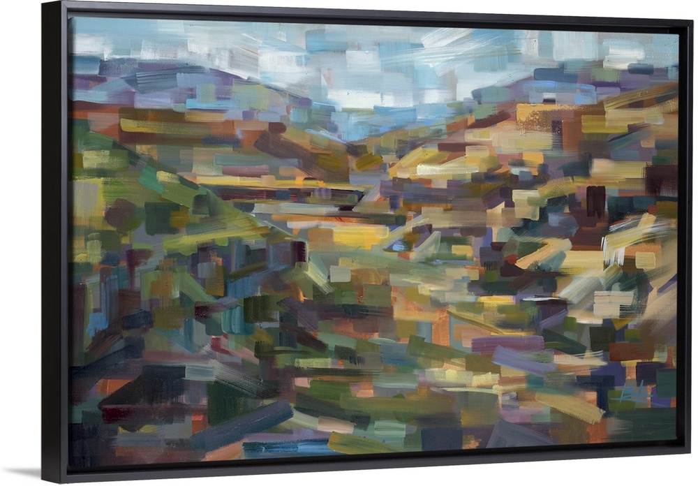 <p>Contemporary abstract painting of a desert landscape deconstructed into geometric shapes.</p>