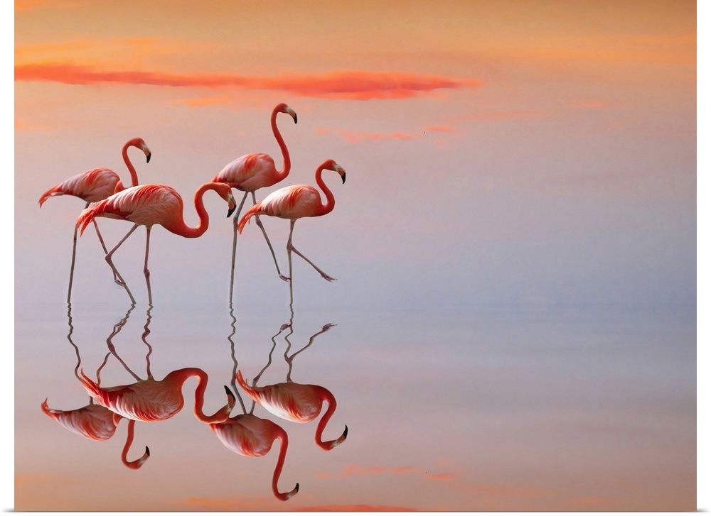 <p>Four flamingos walk delicately in shallow water.</p>