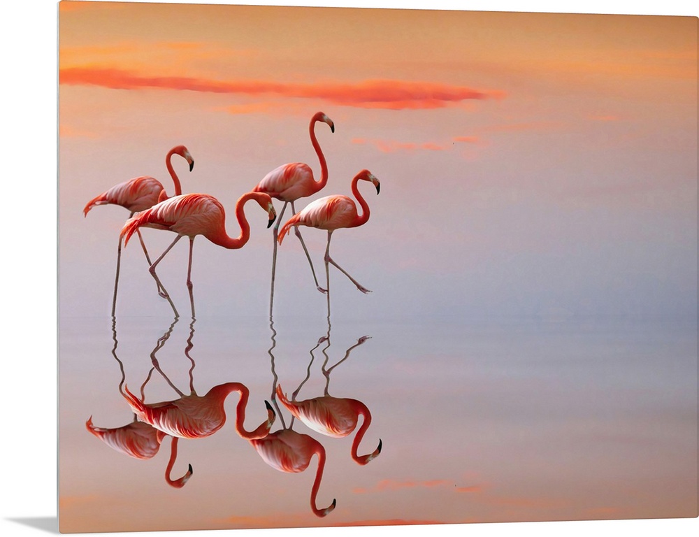 <p>Four flamingos walk delicately in shallow water.</p>