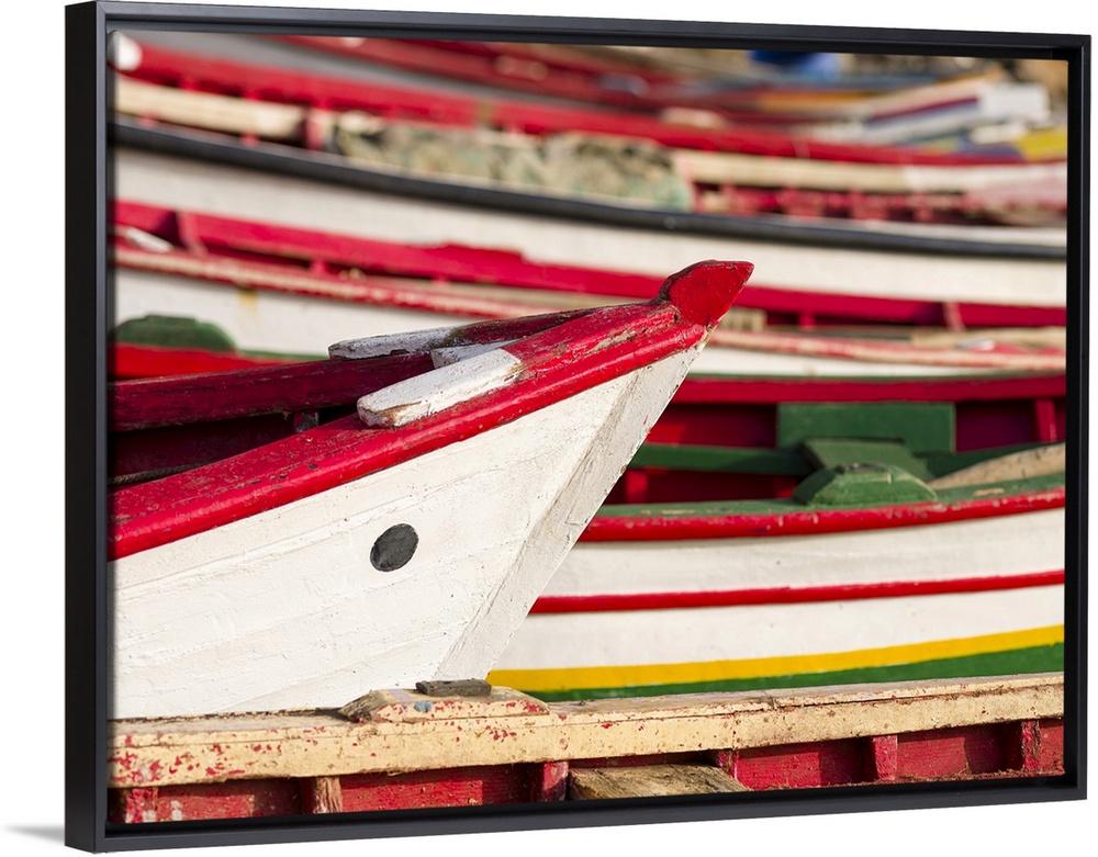 <p>Colorful traditional fishing boats at the historic waterfront. Cidade Velha, historic center of Ribeira Grande (UNESCO World Heritage Site). Santiago Island, Cape Verde in the Atlantic Equatorial.</p>
