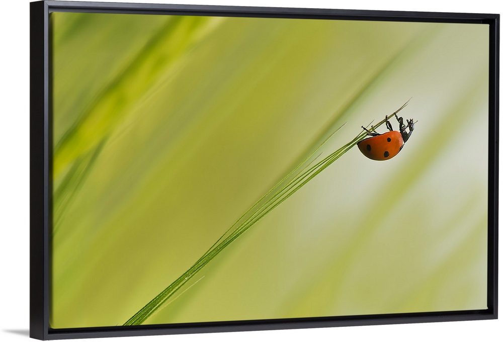 <p>A ladybug hangs upside-down from the tip of a blade of grass.</p>