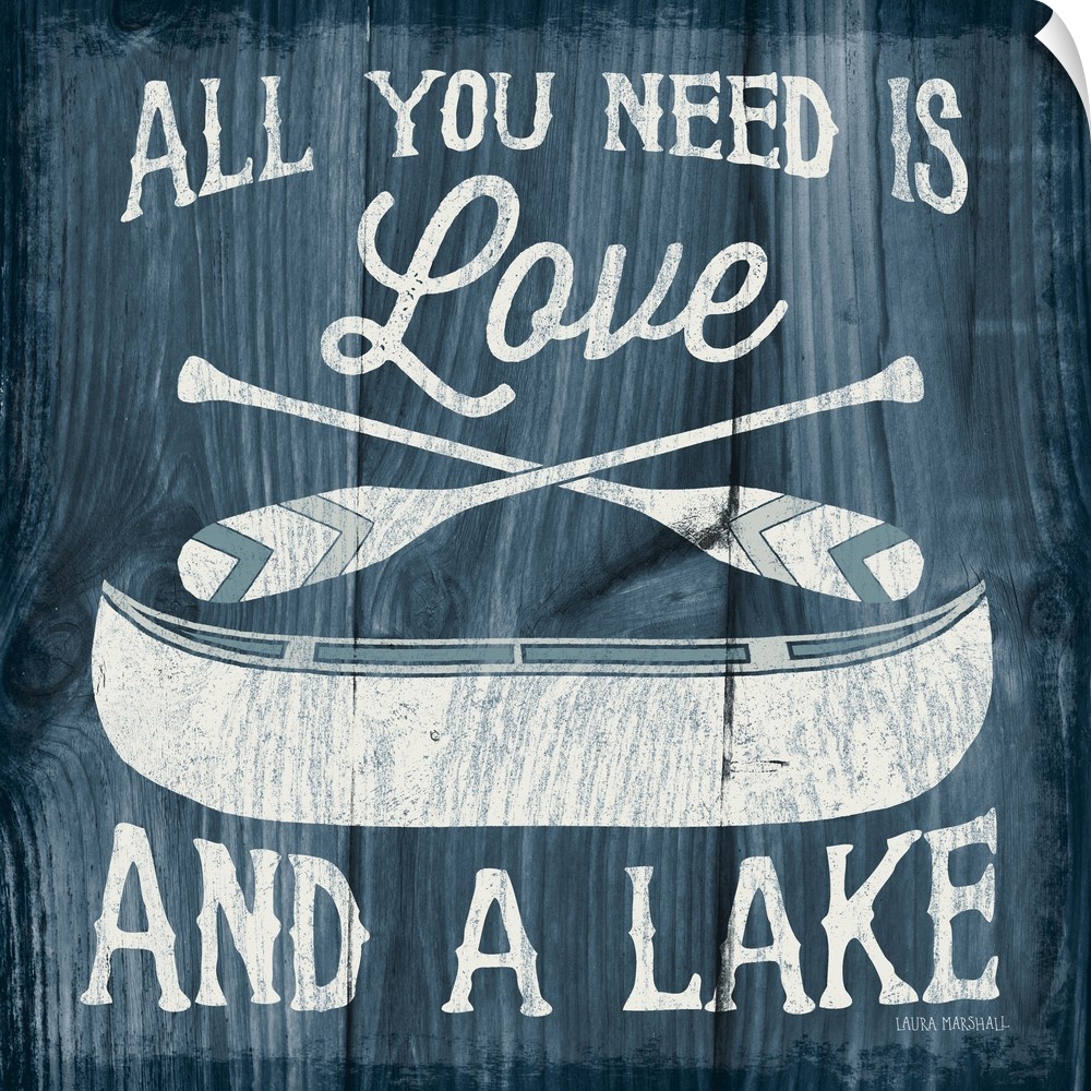 <p>"All You Need is Love And a Lake" in white with an illustration of a canoe and paddles on a dark blue wood grain background.</p>