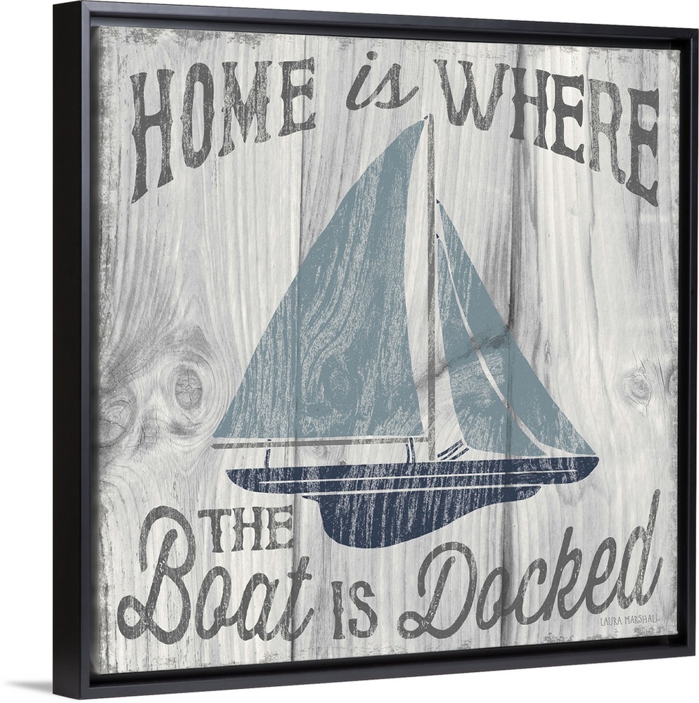 <p>"Home is Where the Boat is Docked" in grey with an illustration of a sailboat in shades of blue on a white and grey wood grain background.</p>
