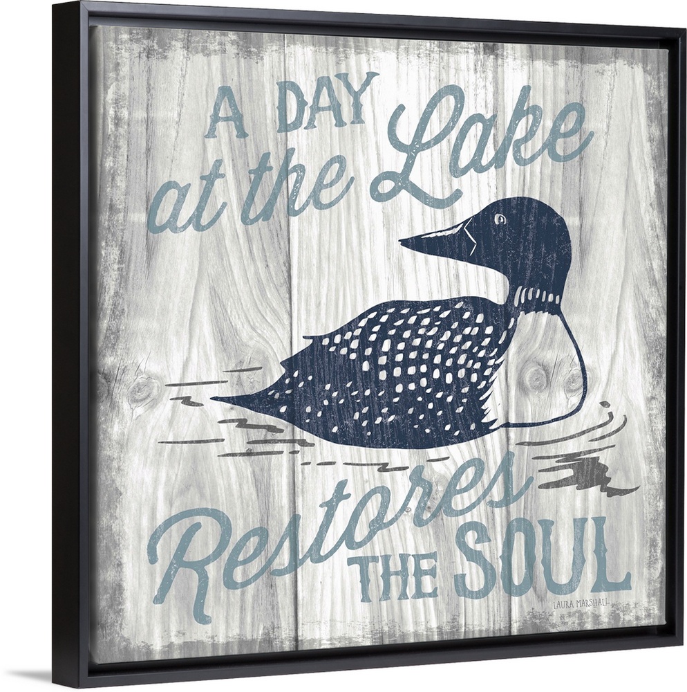 <p>"A Day at the Lake Restores the Soul" in blue with an illustration of a duck on a grey wood grain background.</p>