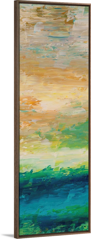 <p>Vertical abstract painting reminiscent of the sky in the morning.</p>