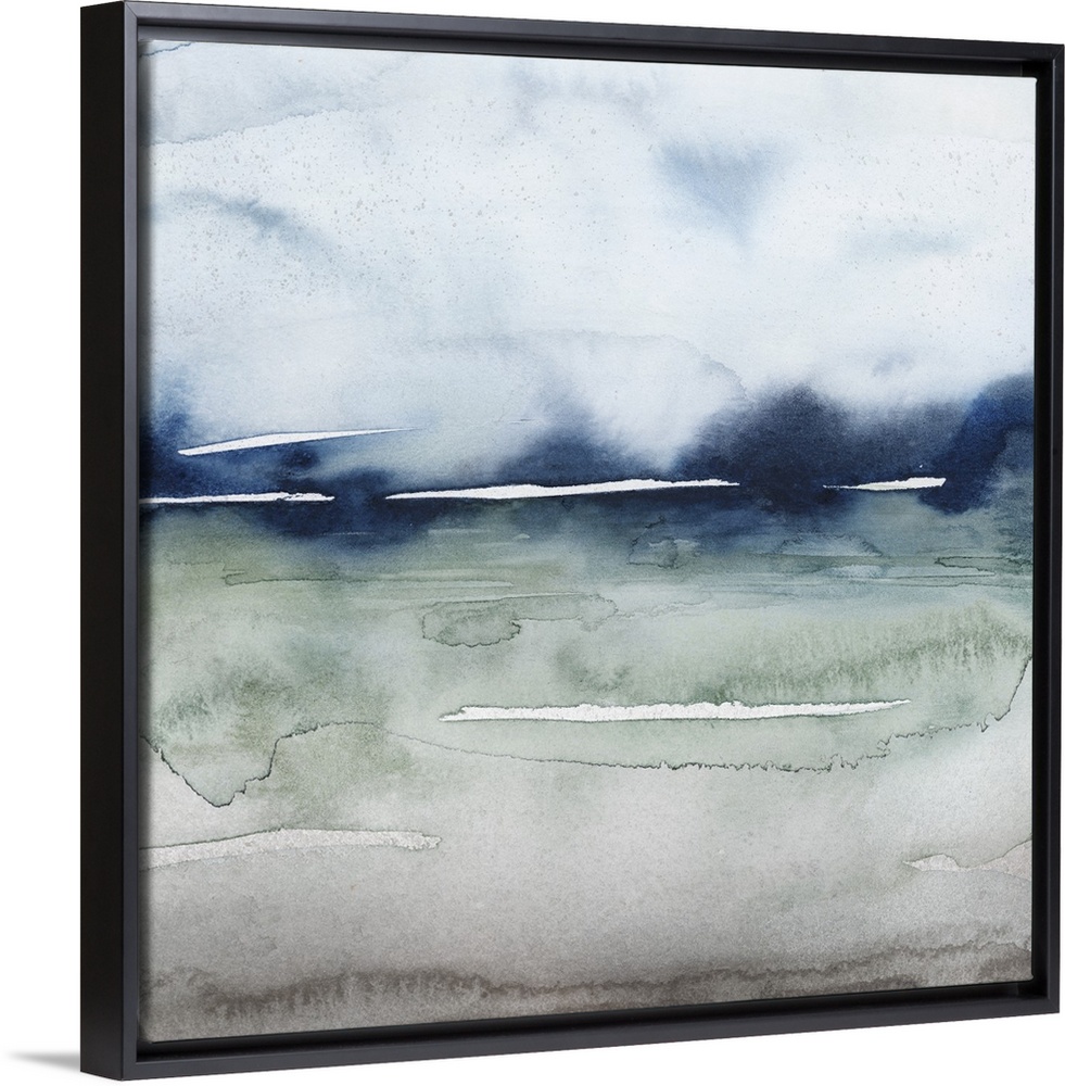 <p>Square watercolor landscape in muted, blended colors of blue and green.</p>