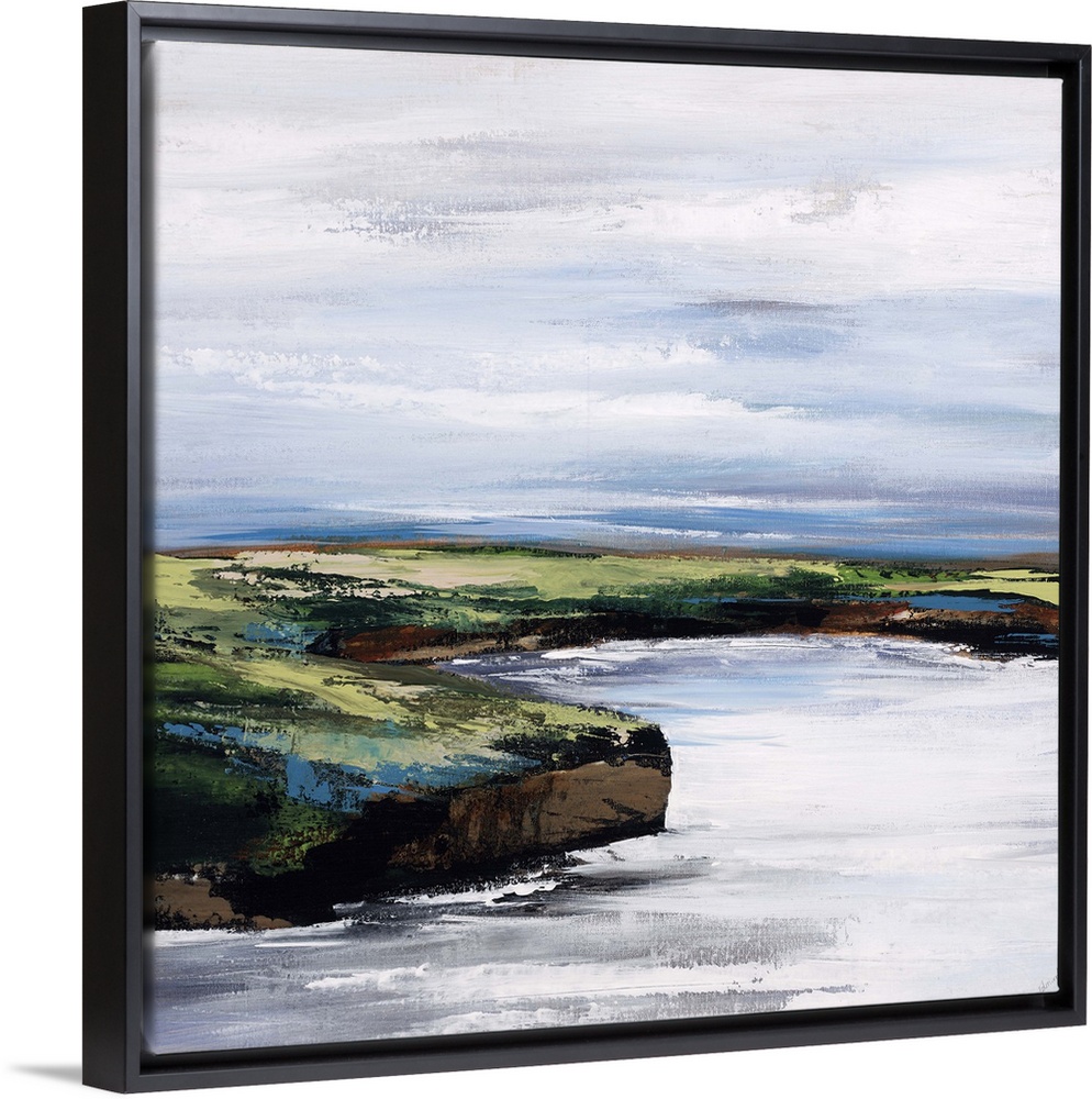 <p>Landscape painting of a curving shoreline that rises above the water, beneath a blue sky streaked with wispy white clouds.</p>