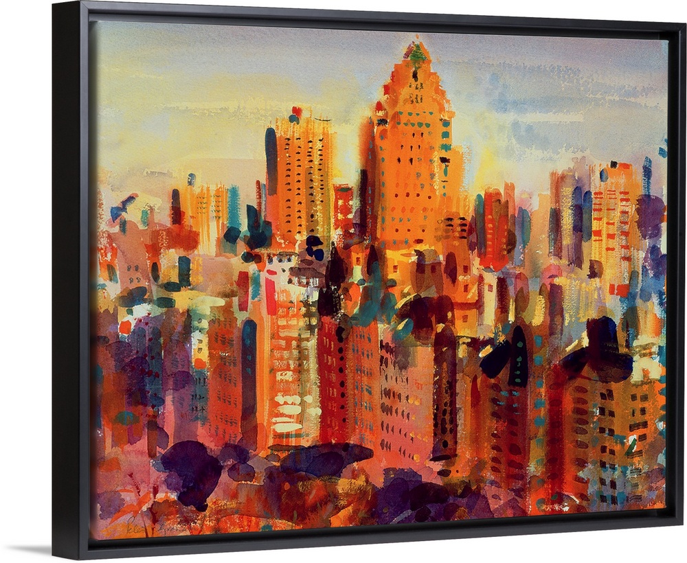 <p>Big contemporary art portrays an aerial view of the tall skyscrapers and buildings that fill New York City through the use of vibrant water colors. Artist utilizes a lot of short brush strokes to represent the minimally detailed buildings.</p>