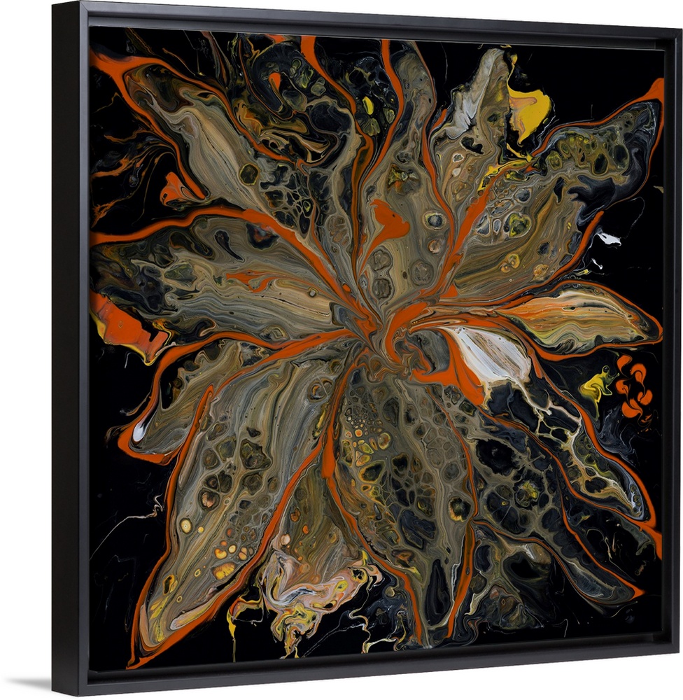 <p>Pour painting of a flower outlined with bright orange that complements its neutral-colored petals with the striking patterns and a dense black background.</p>
