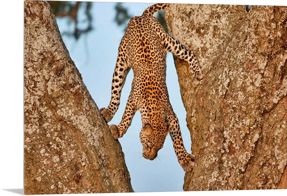 <p>Playful photograph of a leopard climbing down the middle of two rocks.</p>