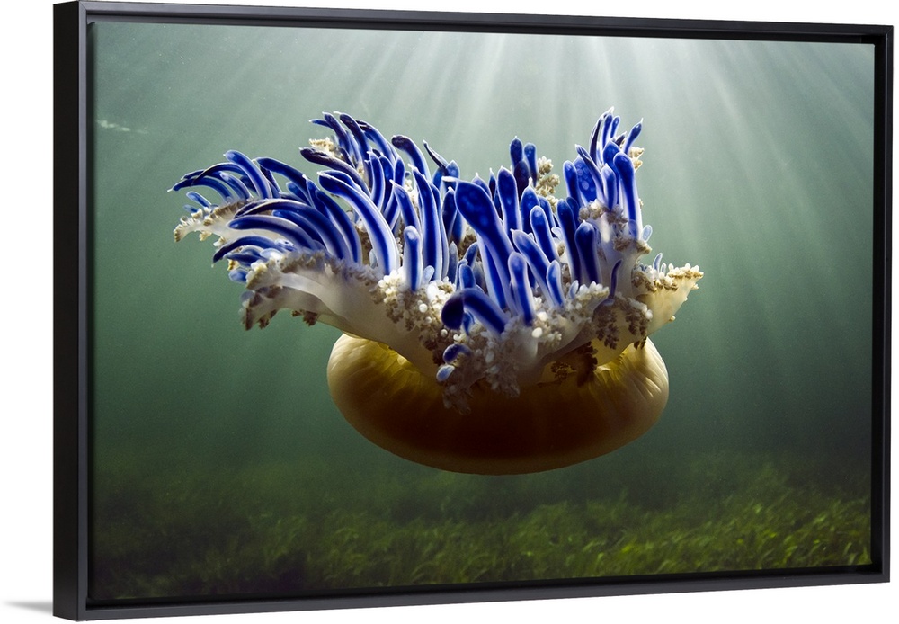 <p>Landscape photograph of an upside down jellyfish (Cassiopeia sp.) floating through sunlit waters in Jardines de la Reina National Park, Cuba.</p>