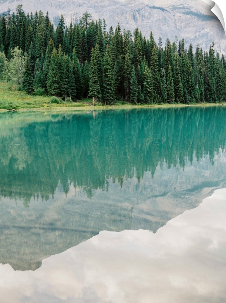<p>Photograph of mountains reflected in the glassy surface of Moraine Lake, Emerald Lake Lodge, Banff, Canada.</p>