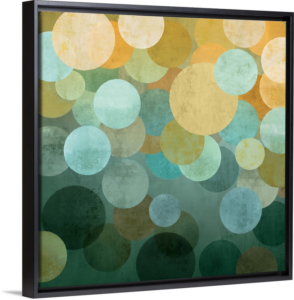 <p>Square abstract art created with circles in yellow, blue, and green hues overlapping together on a dark teal background.</p>